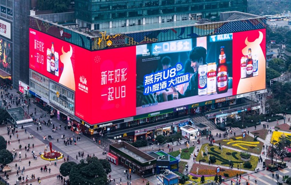 在2月5日晚上20:00在上海外滩开启燕京啤酒无人机展演,吸引众多人流驻足观看;2月7日晚19:00杭州钱塘江燕京啤酒拜年灯光秀,闪耀杭州;2月9日起,燕京啤酒X王一博震撼登陆重庆观音桥苏宁巨幕LED;与此同时,燕京新春广告同步登陆北京,金华,衡阳,衡山、襄阳,中山等城市高铁站,给全国人民拜年。